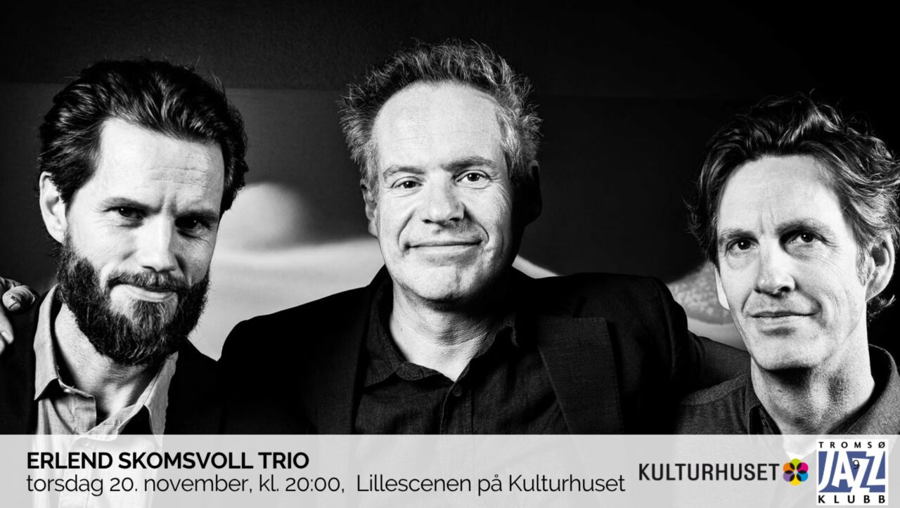 Tromsø Jazzklubb: Erlend Skomsvoll trio Spelemannspriser i jazz og klassisk, Buddyprisen, vinner, fenomenale prosjekter med Chick Corea, Pat Metheny, Trondheim jazzorkester, Come Shine, KORK og mye annet. Nå med egen musikk og egne arrangementer i samspill med bassist Roger Morland og slagverker Knut Aalefjær. Lekent, originalt og fortryllende!